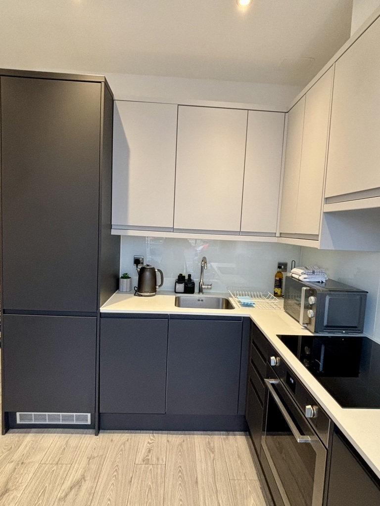 This stylish home features an inviting open-plan living area with a comfortable sofa, Smart TV, and dining space, ideal for relaxing after a busy day. The fully equipped kitchen includes everything you need to prepare meals, from a sleek hob and oven to a microwave, fridge-freezer, dishwasher, and all the essentials for cooking and dining.