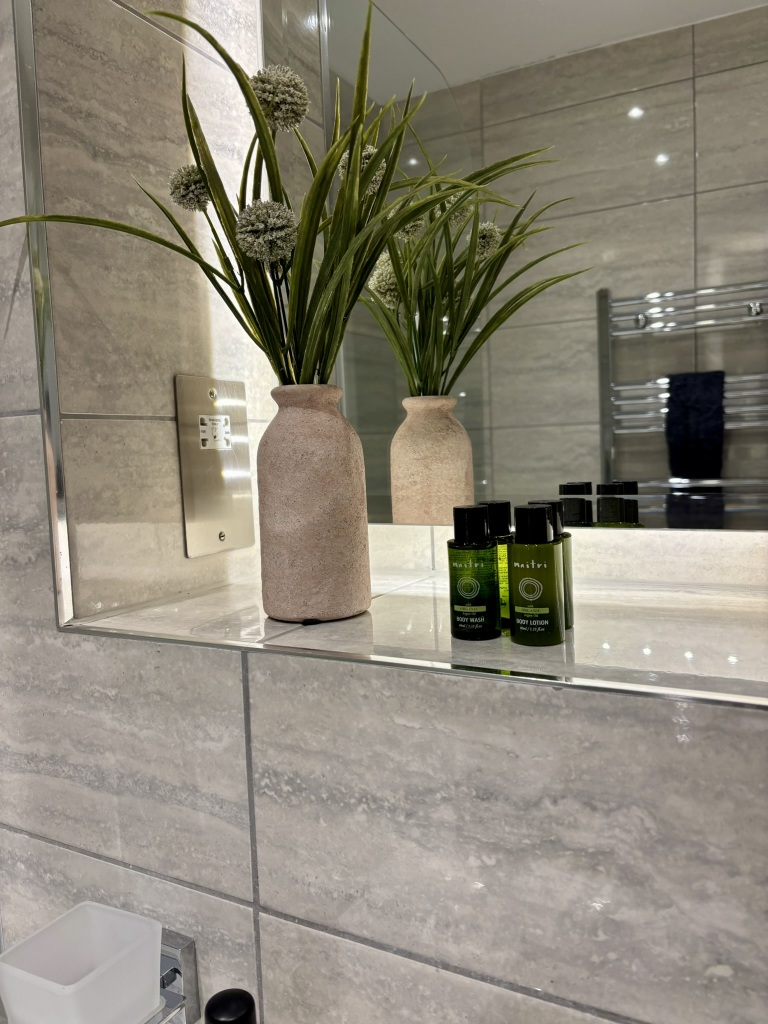 The bedroom area offers a plush double bed with crisp linen, bedside tables and lamps to ensure a restful night’s sleep. A contemporary bathroom with a powerful shower, relaxing bath & fluffy towels. Complimentary toiletries completes the space.